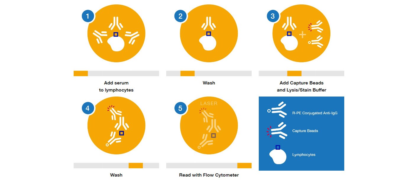Il test One Lambda™ FlowDSA-XM™ è un test di compatibilità basato sulla citometria a flusso, ottimizzato per la rilevazione di anticorpi leucocitari. Combinando il tradizionale test di compatibilità cellulare tramite citometria a flusso con la specificità della tecnologia delle microsfere, il test FlowDSA-XM distingue selettivamente gli anticorpi leucocitari dagli autoanticorpi. Dopo l’incubazione dei linfociti con siero umano, qualsiasi IgG legata sulla superficie cellulare viene marcata con anti-IgG umana marcata con R-PE. Le microsfere di cattura FlowDSA-XM si legano selettivamente al complesso anticorpo/antigene/anti-IgG umana risultante e l’intensità della fluorescenza viene misurata per indicare la quantità relativa di anticorpi leucocitari presenti nel siero